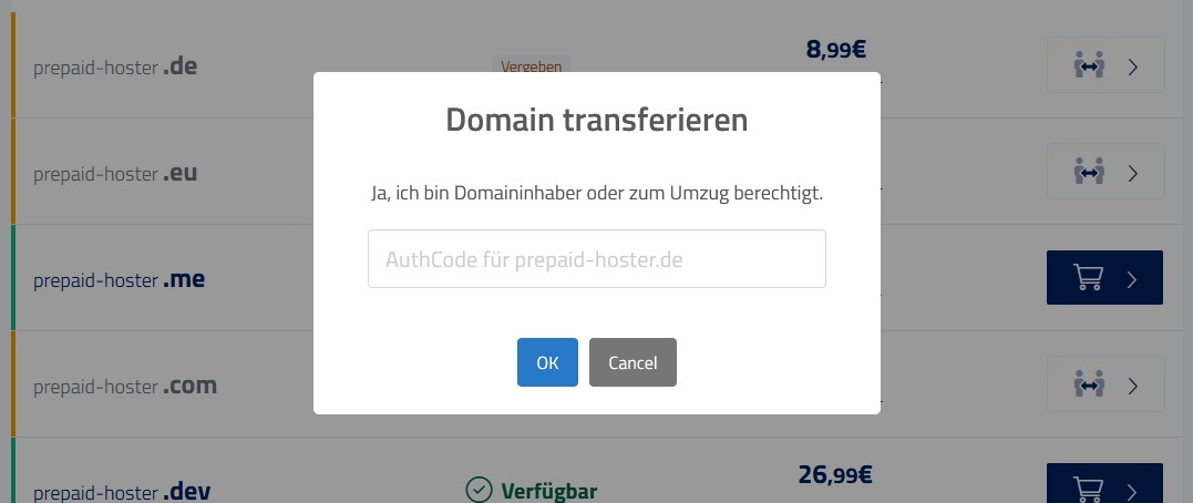 Unser Domain Transfer Service ist einfach und unkompliziert. Alles, was Du benötigst, ist eine gültige Registrierung und den Autorisierungscode von Deinem aktuellen Registrar. Sobald Du diese Informationen hast, kannst Du zu uns wechseln und den Transferprozess starten.