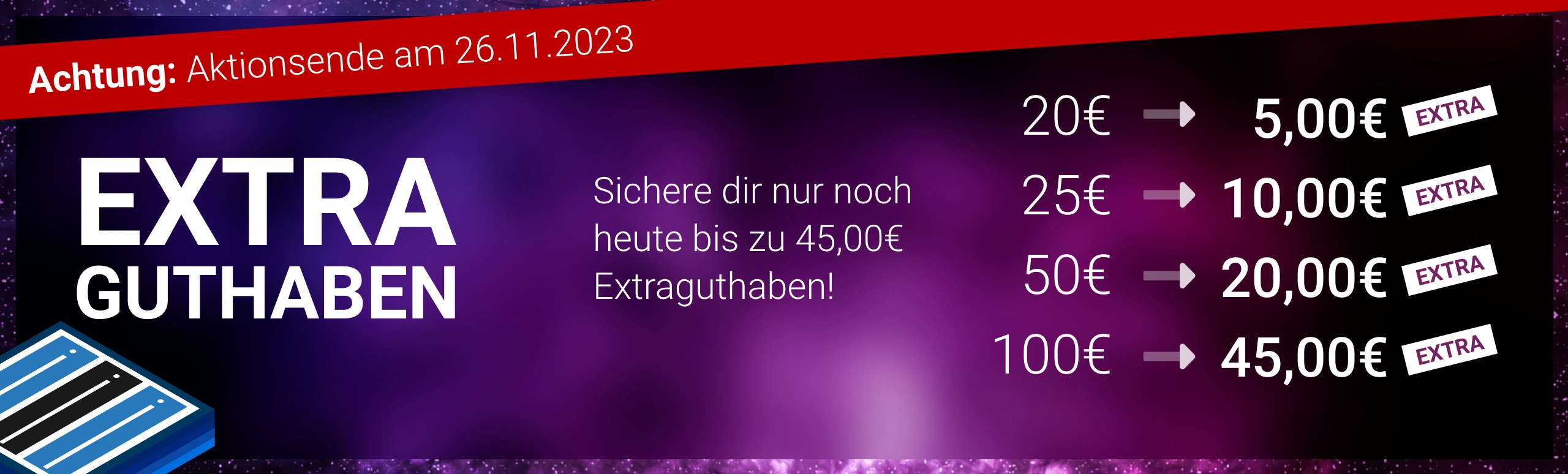 Stell dir vor du möchtest deinen Server für 25€ verlängern, lädst 25€ auf und hast durch die Bonus-Aktion plötzlich insgesamt 35€ Guthaben. Gut oder? Sichere dir ab Freitag den 24.11.2023 bis Sonntag den 26.11.2023 bis zu 45€ zusätzlich zu deiner Aufladung.